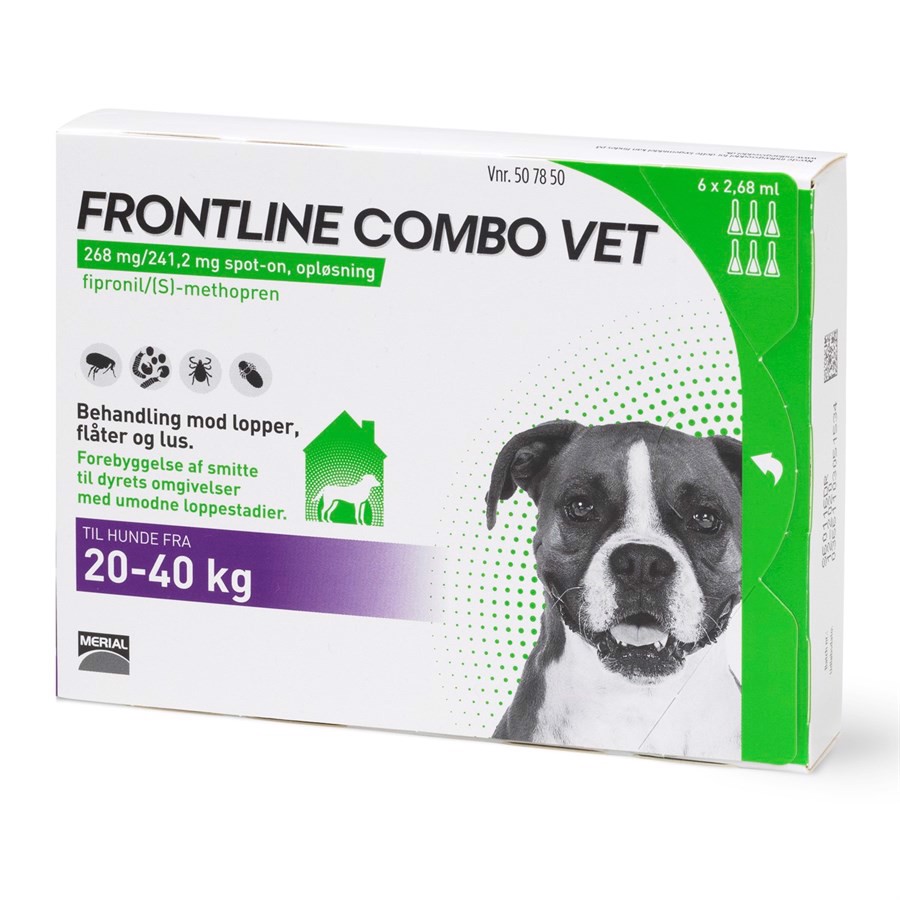 Frontline Combo beskytter både hunden, katten og omgivelserne mod lopper. Med det nye Frontline Combo kan du nu både behandle og forebygge effektivt mod lopper på dine dyr og samtidig beskytte dit hjem m